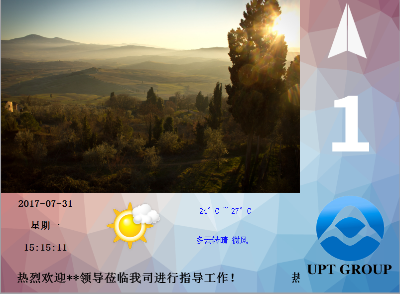 软件功能特性: l 界面灵活配置:可以根据需求任意分割显示界面,任意修改各控件的位置、颜色、大小、方向、内容等 l 电梯信息实时显示:电梯运行状态,楼层、运行方向、超载、运维、满员、司机、泊梯、检修、火警等信息显示 l 强大多媒体播放:多格式支持 H264、MPEG2/4、H263、MJPEG、VC1、DivX、Xvid等,最高支持1920x1080 l 节电运行功能:支持通过配置文件自行设置关屏时间,当电梯无动作(无上下行信号,电梯处于正常运作状态)时间达到10秒后(可自行设置时间),显示器自动关闭背光,节电并延长显示器使用寿命 l U盘更新:支持通过U盘更新界面内容,U盘更新音量、时间设置功能 l 强大的网络管理功能:通过网络管理软件,做到播放文件、配置文件、电梯相关文件的实时上传替换 l 内置天气预报功能:可通过网络实时更新天气预报 |